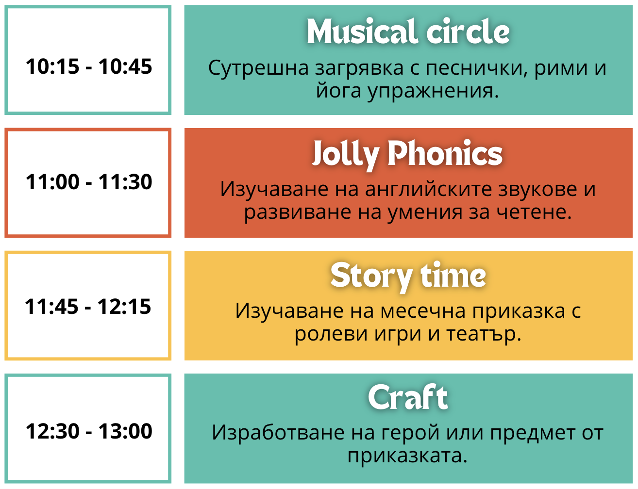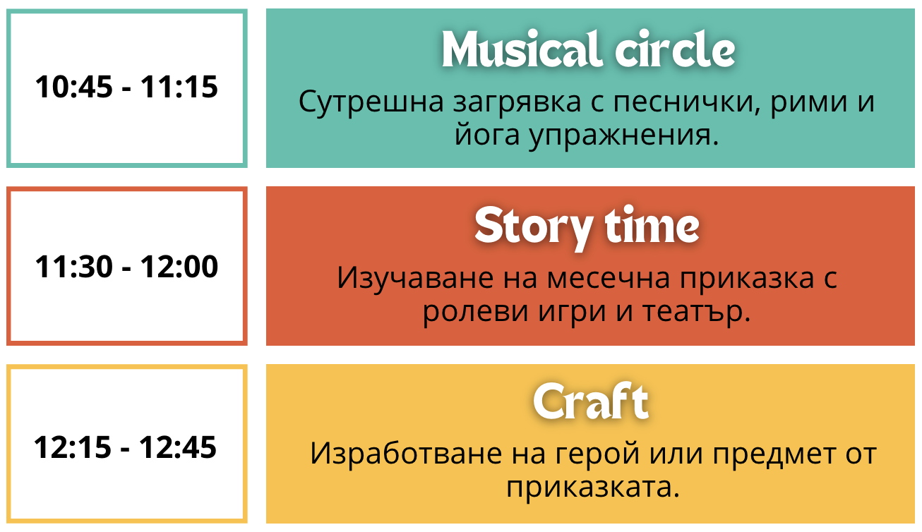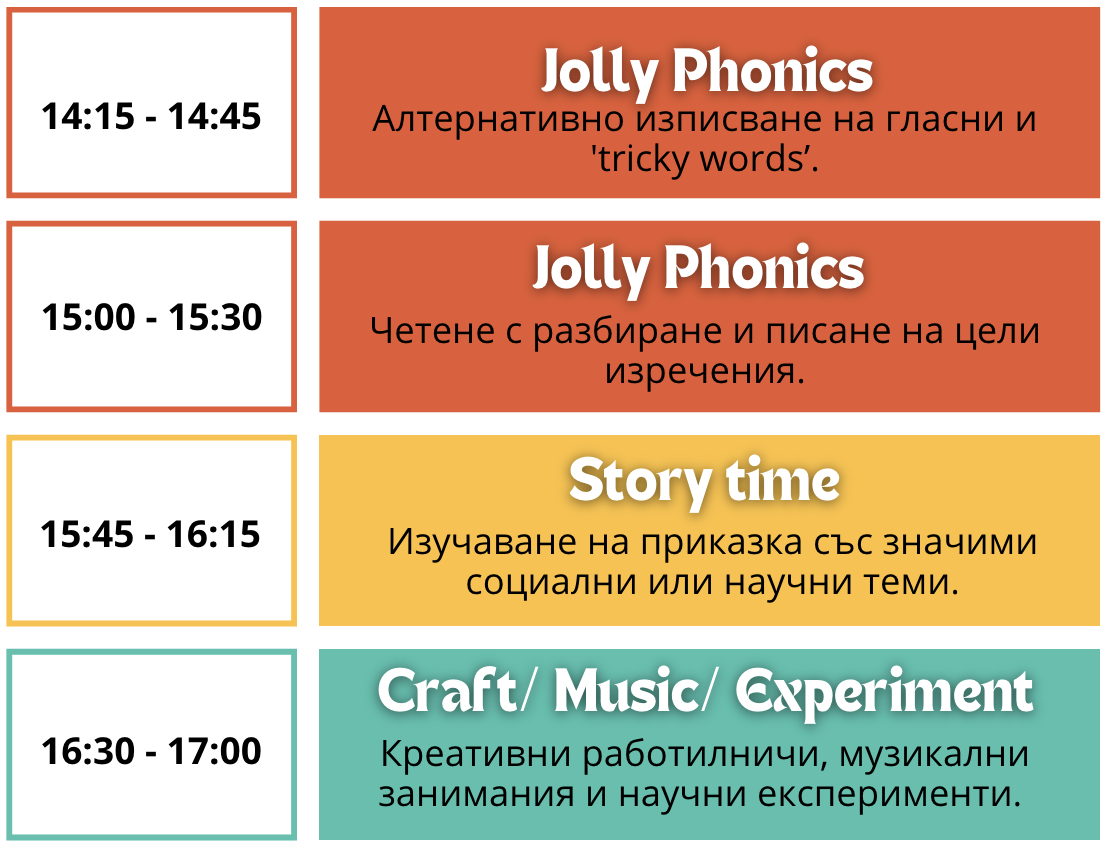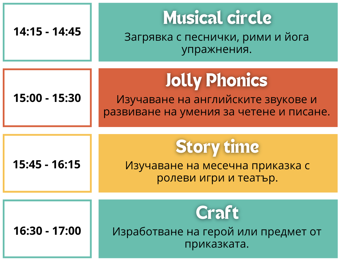 Запазваме любимите елементи – музиката, ролевите игри и приказките – като ги комбинираме с целенасочена работа по Jolly Phonics. Така детето едновременно се забавлява и надгражда уменията си за четене и писане.